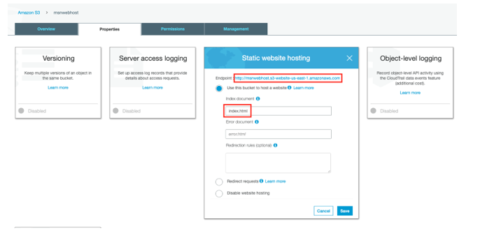 5.Enable the “Static website hosting” and configure as below. Enter “Index document” as “index.html”. Copy the “Endpoint” URL - the web app that will be hosted is accessed using this endpoint.