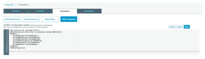 6. Click on “Permissions” tab and go to “CORS configuration” and paste the below XML code and click “Save”. This will allow cross origin access.
