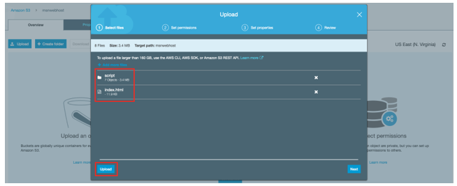 3. Go the S3 bucket that was created in step “3” and drag the “index.html” as well as “script” directory as below and click “Upload”.