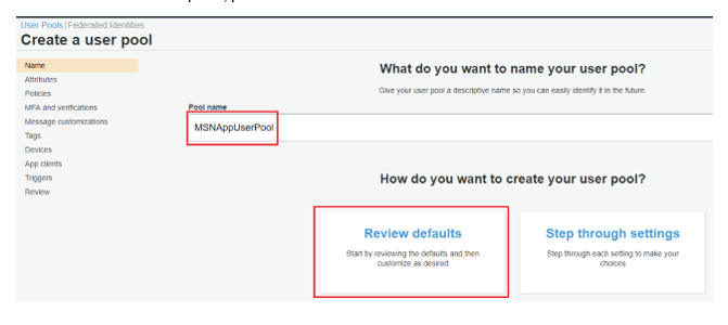 2.Click “Create a user pool”, provide a “Pool name” and click “Review defaults” as below.