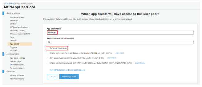 6.Give an “App client name” and uncheck “Generate client secret” as below. The reason for this is, to quote from AWS document, “when creating the App, the ‘generate client secret’ box must be unchecked because the JavaScript SDK doesn’t support apps that have a client secret.” — AWS Document. Click “Create app client”.