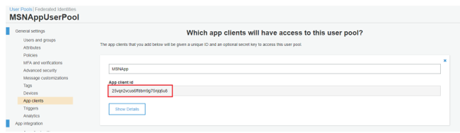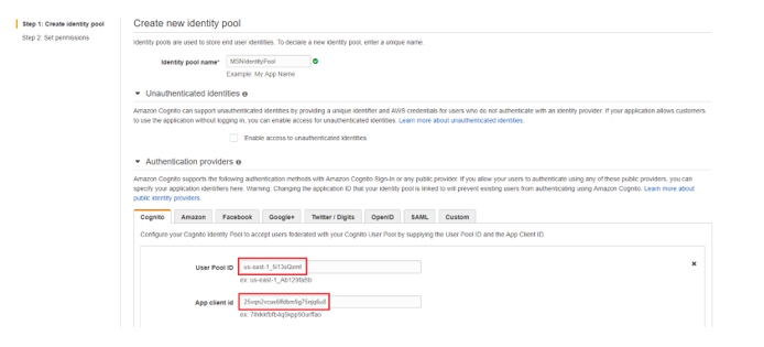 3.Paste the “Pool Id” copied in step 1.4 in the “User Pool ID” field, and paste the “App client id” copied in step 1.7 in the “App client id” field.