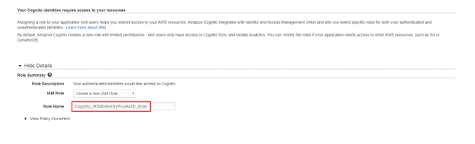 4.In the “Your Cognito identities require access to your resources” page, take note of the IAM Roles that will be created for authenticated and unauthenticated users as displayed below. Necessary IAM Role Policy will need to be given to these roles. In this example, the authenticated user role which is “Cognito_MSNIdentityPoolAuth_Role” will be given full AWS S3 access. This will be done in the next step. Click “Allow” to finish creating Identity Pool.