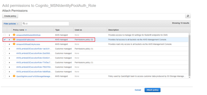 2.Search and add “AmazonS3FullAccess” as below and click “Attach policy”. Now any authenticated user that will assume this role will have access to work with AWS S3.