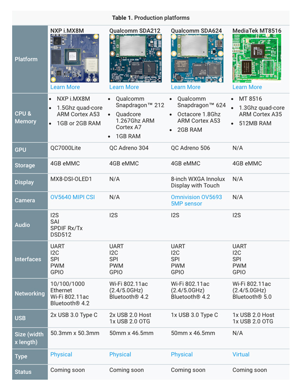 Production System-on-Modules (SoMs) are fully supported for production use cases and SoMs are certified by Google to meet security requirements. Android Things’ stability and security updates will be available for a minimum of 3 years on all production SoMs. The following table will show SoMs currently supported by Google (see Table 1).