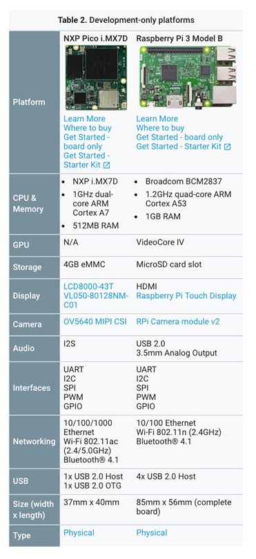 Development platforms are provided to enable prototyping and testing. They do not meet Google's security standards and may not receive stability and security updates. Google will continue to provide feature updates to ensure that you can develop on these platforms and seamlessly port your code over to a production platform. Table 2 shows the development platforms currently supported.