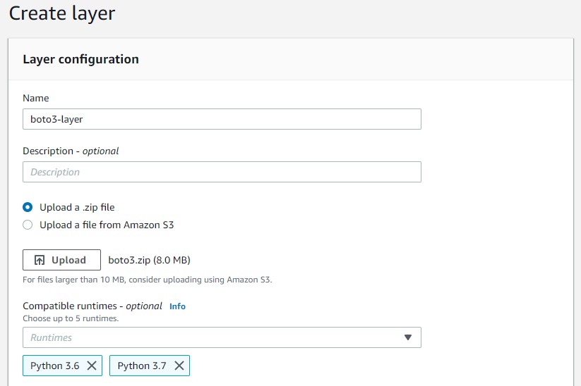 This will create a “boto3" Python package for the AWS Textract SDK which will be used as a Lambda layer. Please note that “Compatible runtimes” should be the same as the Lambda function’s runtime which will use the layer.