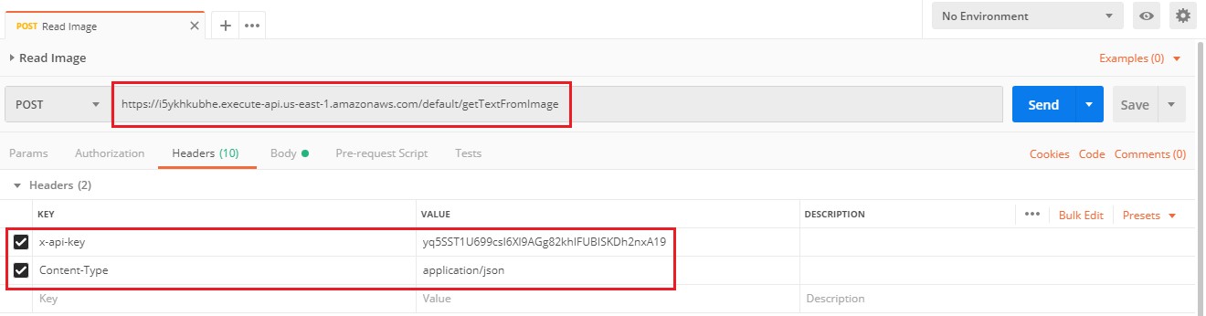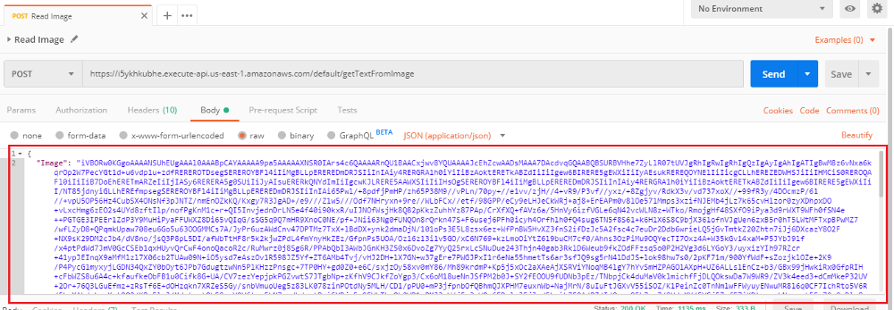 This code expects a Json body with an “Image” parameter and its value as the Base64 encoded image string. A sample payload which you can use is displayed below.