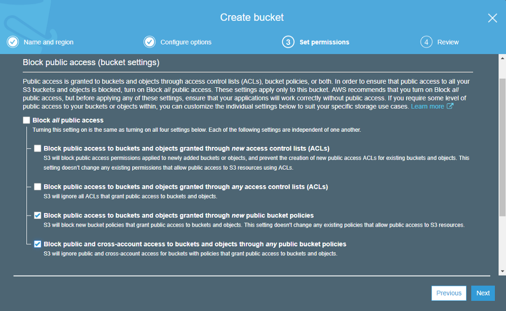 2.Enter “Bucket name” and “Region” same as the region that will be used in the Lambda function and click “Next”.