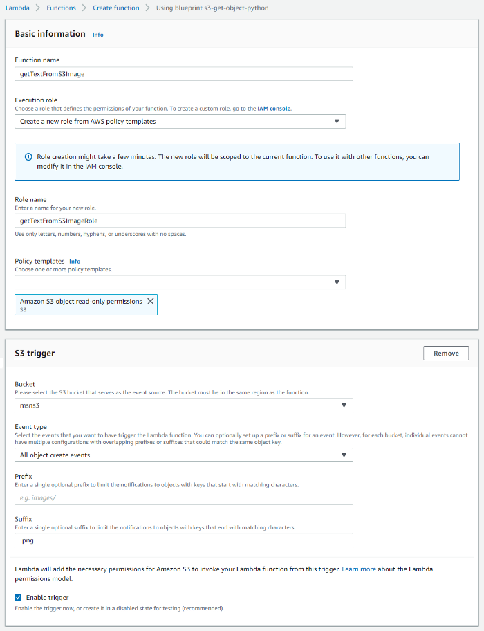 3.Enter “Function name”, “Role name” and select the “Bucket name” as the S3 bucket created in the previous step. Make sure to add “Suffix” to restrict the trigger only for PNG images. Fill out the rest of the settings as below.
