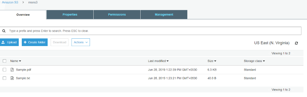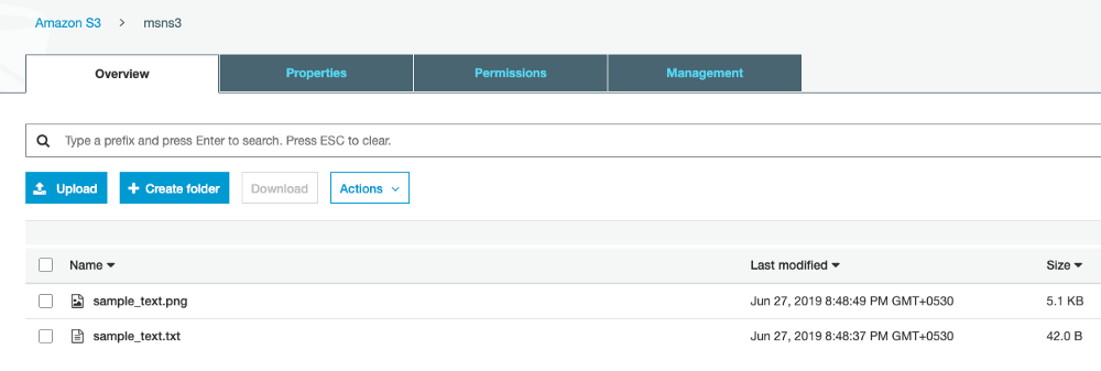 Go to the S3 bucket and upload a PDF file. You can get a sample PDF file from here. After about 1 minute a text file with the same name as the PDF will be generated. This text file contains the text result extracted from the PDF.