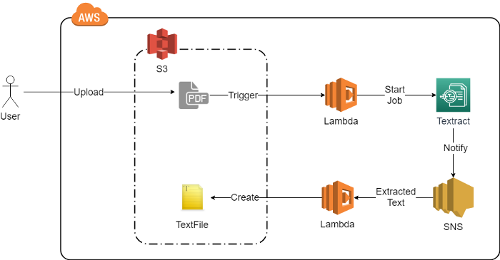 This example will implement a Lambda which will be triggered whenever a PDF document is uploaded to the S3 bucket. The Lambda function will start a text extraction processing job. Once the AWS Textract completes the job, it will send a notification to the AWS Simple Notification Service which will trigger another Lambda. The Lambda triggered from the AWS SNS Service will get the text extraction job result from the payload. It will write the results to a text file in the S3 bucket with the same name as the PDF.