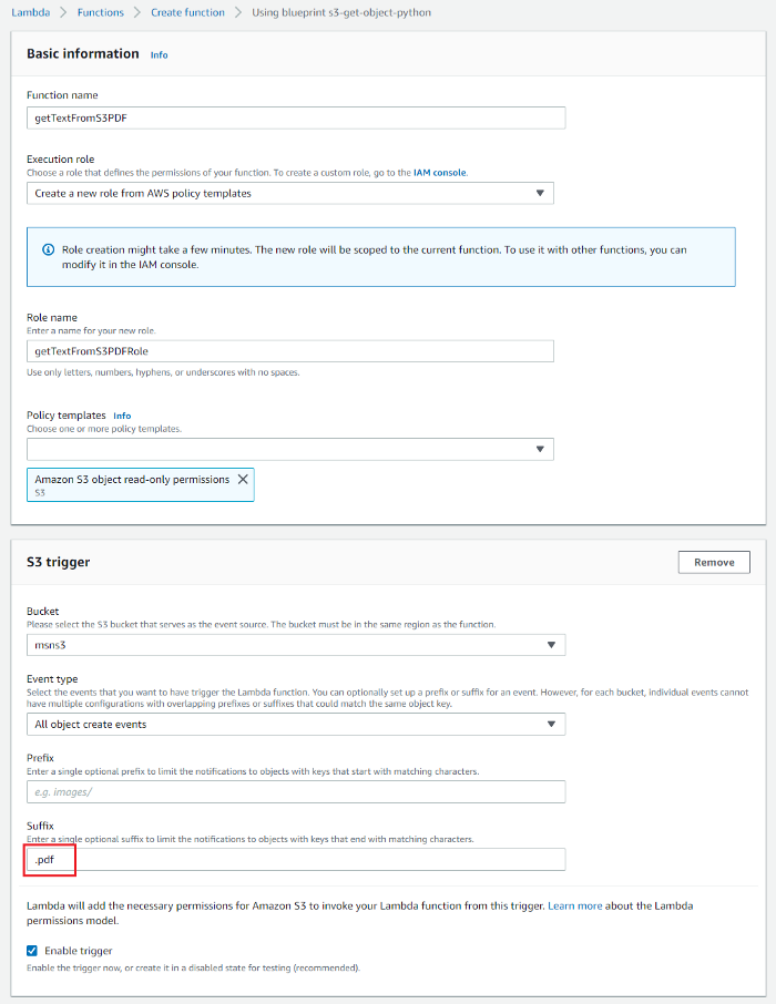 1.Create another S3 triggered Lambda function following steps listed in section 1.2.2, with the only difference being instead of the suffix “png” the suffix “pdf” will be used to trigger PDF documents.
