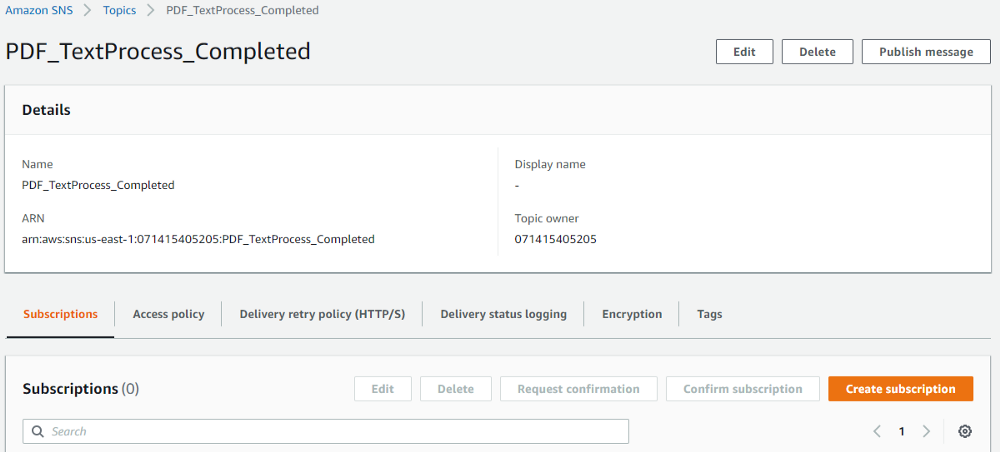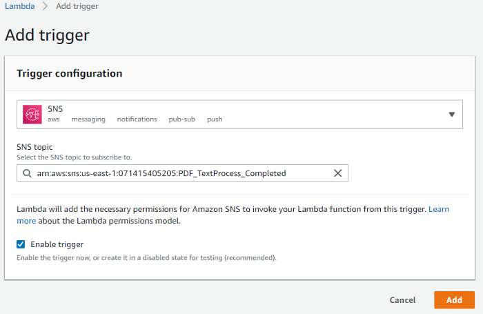 4. Click “Add trigger” from the Lambda designer and configure the subscription to the “PDF_TextProcess_Completed” topic that was created in step 2.2 and add the trigger.