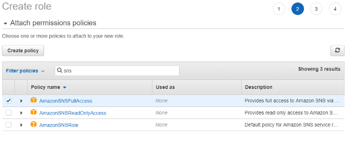 3.Go to the “Permissions” section and add the “AmazonSNSFullAccess” policy.