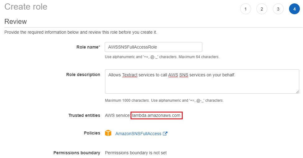 4.Give the role name as “AWSSNSFullAccessRole” and create the role. Please note, under “Trusted entities” Lambda service is provided. This is because the AWS Textract service was not available to be selected in the initial “Create role” page. We need to change the “Lambda” service to “Textract” service.