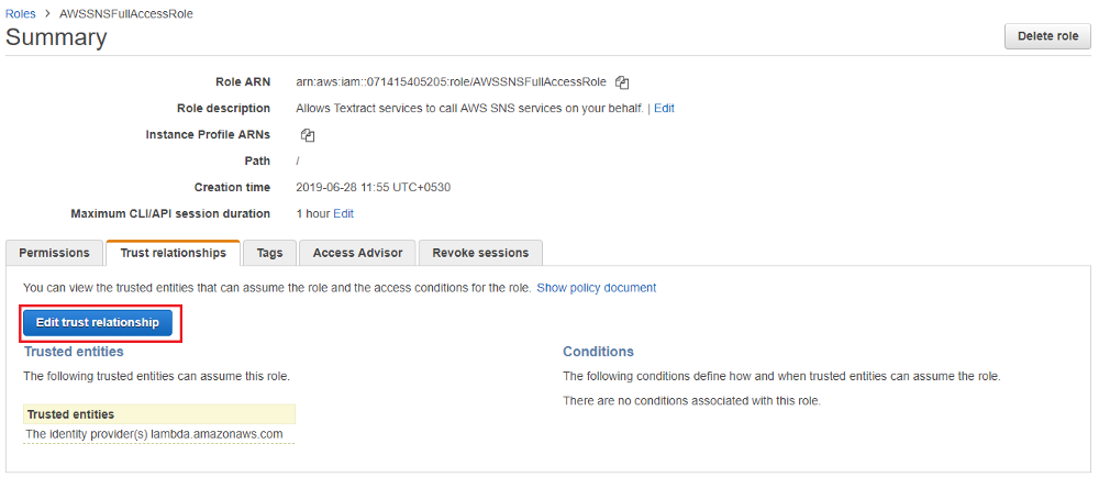 5.Go to “AWSSNSFullAccessRole” role settings and go to “Trust relationships” and click “Edit trust relationship”.