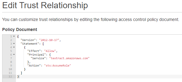 6.Change lambda.amazonaws.com to textract.amazonaws.com and update the trust policy. AWS Textract service will now have permission to send notifications to AWS SNS.