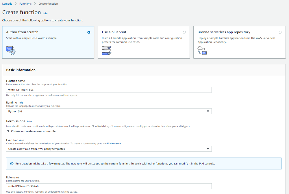 1.Create a new Lambda function from scratch with the name “writePDFResultToS3”.