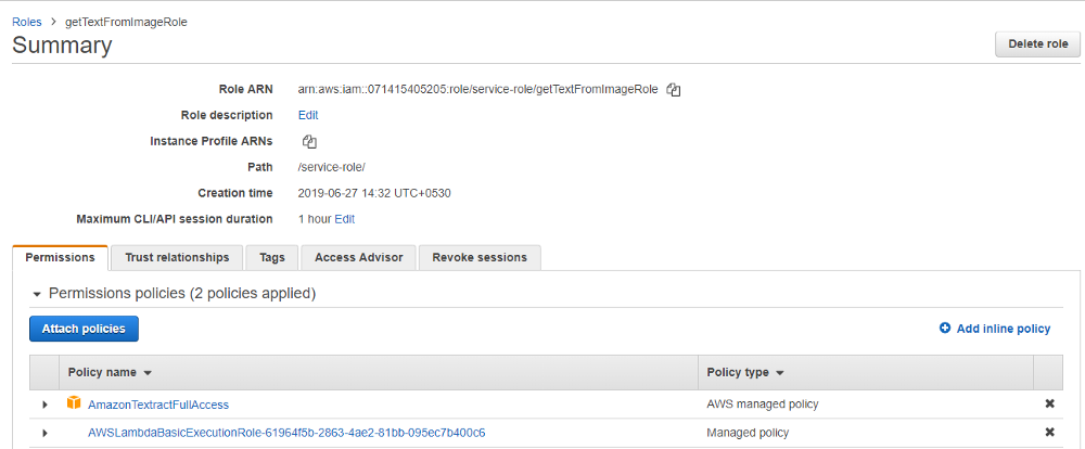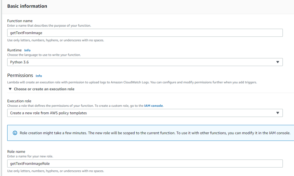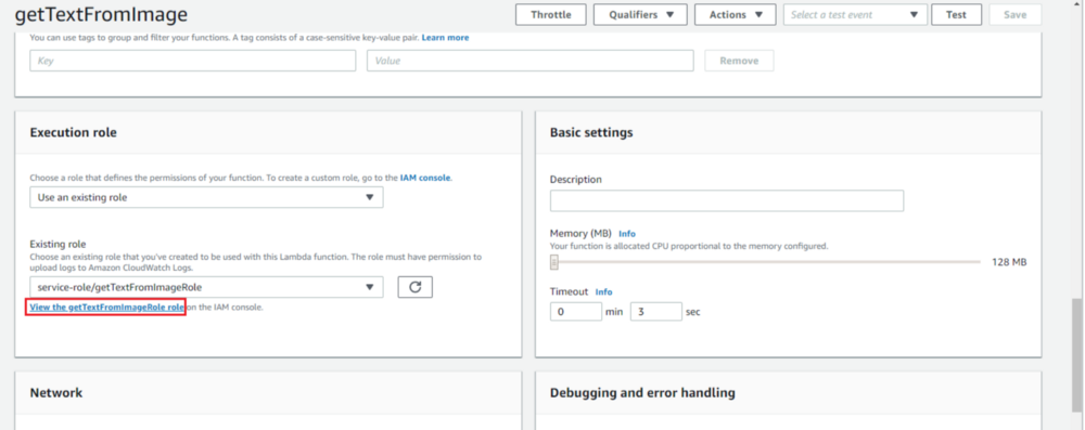 1.Once Lambda is created, click on “View the getTextFromImageRole role” under the “Execution role” section in the Lambda configuration window as displayed below.