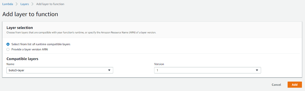 2.Select the “boto3-layer” under “Compatible layers” and then select version 1 as below.