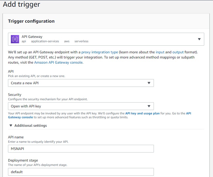 2.Select “API Gateway” and fill out details as below. Note that “Security” is set to “Open with API key” to protect Lambda from anonymous access.