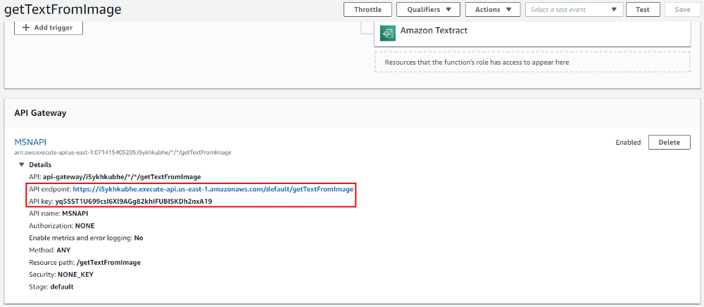 4.Go to the Lambda configuration page and expand the “API Gateway” section to get the API endpoint and the API key as displayed below.