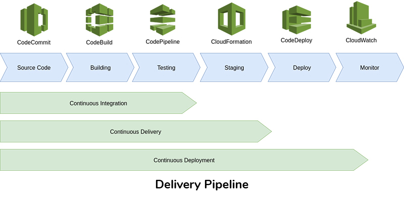 Delivery pipeline represents the sequence of processes that enable propagation of software changes to production. This pipeline may be manual, semi-automated or fully automated. The degree of automation varies from organization to organization though higher degree of automation is always preferred. However more automation means more complexity in the implementation and the components of the pipeline have to be designed according to the type of application (microservices, monolithic, cloud native, etc..) being developed. Following is a depiction of a typical delivery pipeline and various tool offerings, for each stage in the pipeline, by the AWS platform.