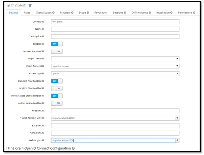 server: port : 8001 keycloak: realm : Test-Realm auth-server-url : http://localhost:8080/auth ssl-required : external resource : test-client cors : true