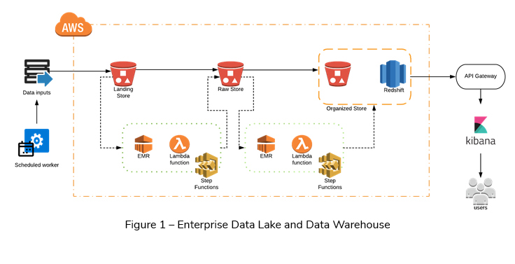 Amazon S3, AWS EMR, AWS Step Functions, AWS Lambda Function, Amazon Redshift, AWS API Gateway, Amazon Redshift Spectrum, Amazon SNS, Quicksight, AWS ElastiCache, AWS ElasticSearch, Apache Parquet, Kibana