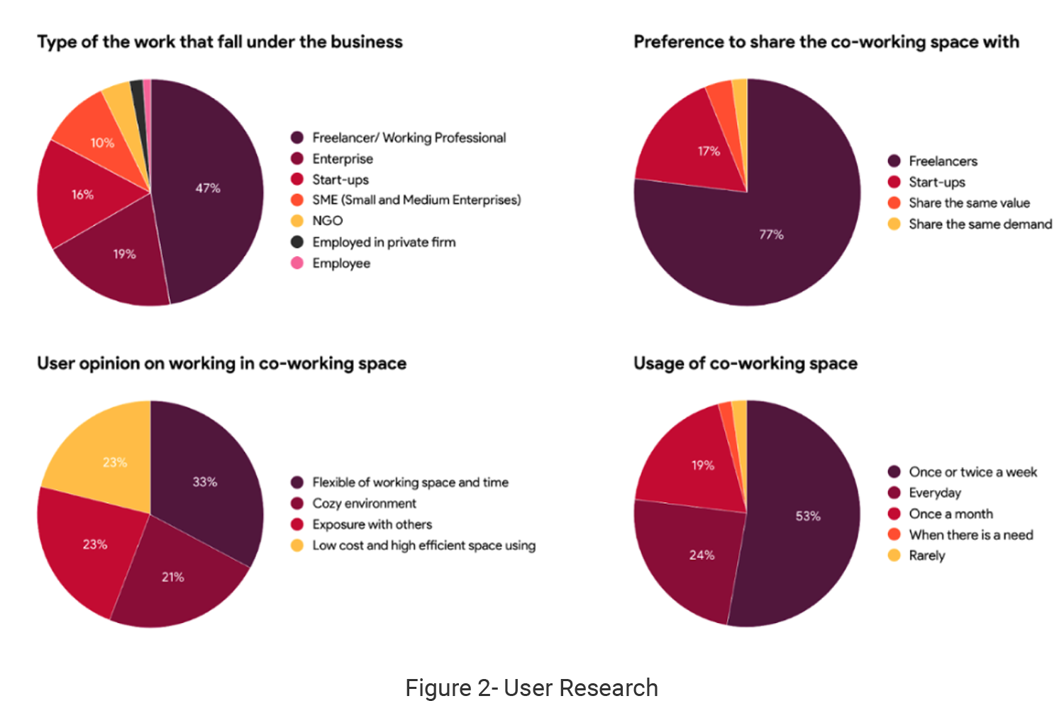 To get some qualitative insights we ran interviews focussing on people who have used some kind of coworking space in the past or fall under our target audience.